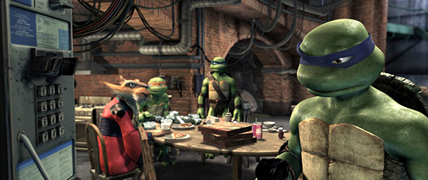Simple comme bonjour, le scénario ? Dans la forme, ça en a tout l’air, mais cette soupe de tortue n’a pas le même goût qu’avant. Sans surprise, le choix de l’animation 3D rend déjà les personnages plus crédibles (surtout Splinter, enfin à l’image d’un vrai senseï), mais le scénario a surtout le bon goût de creuser davantage leurs personnalités respectives (le leader, le geek, le gamin et le violent), quitte à placer leurs tourments intérieurs au centre de la narration. Plus généralement, le film s’attache aussi à remettre au goût du jour des éléments narratifs laissés à l’état d’esquisse dans les précédents films, ne serait-ce qu’en ce qui concerne les liens entre les tortues, ici très fragilisés. On gardera surtout en mémoire le côté impulsif et individualiste de Raphaël, qui rend ce dernier profondément dangereux, pour ne pas dire instable, menaçant la réunification du groupe jusqu’à un duel homérique entre lui et Leonardo sur les toits de New York (sans doute la meilleure scène du film). Ce sont tous ces éléments qui font de TMNT une adaptation bien plus fidèle au comic book d’origine : plus violente, plus sombre, plus tragique, et en même temps toujours aussi drôle. Libérée de la pression du plancher des vaches grâce à la 3D, la mise en scène de Munroe s’autorise même un grand nombre de plans impressionnants, impensables dans les trois autres films, avec de sacrés loopings en skateboard de Michelangelo dans les coursives du métro en guise de mise en bouche. Et quand l’action démarre, même bilan : on est dans de l’action vénère, mettant en scène des tortues d’une surprenante agilité au cœur de combats brutaux situés dans les ruelles les plus sombres de New York et rappelant les effets aériens de la mise en scène de Sam Raimi sur sa trilogie Spider-Man. Même lorsque le film dérive dans sa dernière partie vers le fantastique et la science-fiction, il touche juste, maintenant l’équilibre entre ses qualités graphiques et ses décharges de fun dignes d’un vrai blockbuster hollywoodien.