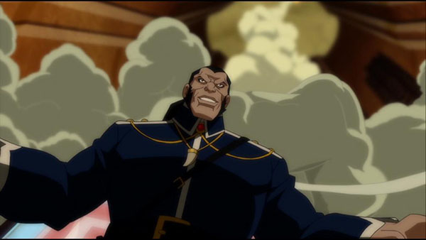 En conséquence, tout comme Mortal développait ses propres idées par rapport à la bande dessinée, Échec prend un déroulement et des réflexions identiques pour se diriger sur un chemin qu’il fait sien. En ouverture, Échec se crée par exemple une excellente scène d’action où la ligue combat le Royal Flush Gang. Outre le fait de constituer une introduction trépidante, la séquence met en relief le statut humain de Batman vis-à-vis de ses collègues. Voilà le genre d’idées qui prépare aux futures révélations tout en préservant la dynamique narrative. Échec fait également un apport pertinent en changeant de nouveau le méchant. Après Ra’s Al Ghul et Maxwell Lord, c’est Vandal Savage qui est maintenant aux commandes. Ce dernier nous vient de loin puisqu’il est né durant la préhistoire. Exposé aux radiations d’un météore, il acquit l’immortalité et une intelligence supérieure. Si le plan de Savage est simple dans cette version (détruire la moitié du monde pour gouverner la partie restante), ce qu’incarne le personnage en fait un choix ingénieux. Provenant de l’aube de l’humanité, Savage nourrit le rapport entre l’homme et le divin qui motive l’histoire.