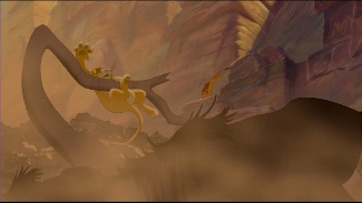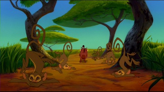 Par là, il faut comprendre que la production utilisera des moyens pour insinuer un sentiment de réalisme dans l’esprit de son spectateur. La capacité des ordinateurs permet ainsi des composites d’images dévoilant un monde s’étendant à perte de vue. Les jeux constants sur les perspectives font en ce sens du film un candidat parfait pour une conversion en 3D. Mieux, la caméra peut se permettre des mouvements de caméra compliqués grâce à cette assistance. La capacité de la caméra à se mouvoir dans cet univers insinue l’idée que celui-ci nous englobe dans son intégralité et ne correspond pas juste à un dessin plat. Cela renforce la croyance en la véracité de l’environnement. Quitte à jouer les manipulateurs jusqu’au bout, l’équipe ira jusqu’à reproduire des défauts inhérents à un tournage traditionnel. Dans la scène d’ouverture, un plan simule ainsi la mise au point de la caméra en floutant les fourmis au premier plan au profit des zèbres en arrière plan et vice-versa. Le spectateur ayant assimilé (souvent sans le savoir) ce genre de détails, on lui communique ainsi l’idée d’une scène prise sur le vif. Rajouté à des effets comme des ombres ou des poussières, Le Roi Lion se constitue un large panel d’artifices. Enumérés en tant que tels ils paraissent grossiers mais leur utilisation soigneuse et judicieuse assure leur réussite.