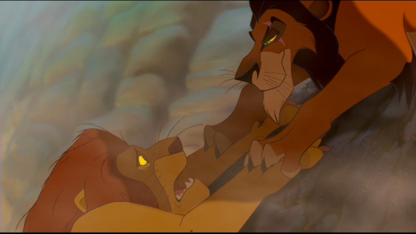 Que raconte désormais Le Roi Lion ? L’histoire d’un royaume gouverné par un roi modèle de sagesse. Alors qu’il transmet à son fils les préceptes d’une responsabilité qui lui incombera, son frère avide de pouvoir montera une machination pour le tuer et faire exiler son fils. Des années plus tard, le royaume est au bord de la destruction et le fils y revient pour reprendre le trône qui est sien. Un récit de meurtre, de doute, de moralité agencée dans une habile série de quiproquos et de rebondissements magnétiques, le tout avec un pur respect des préceptes shakespeariens. L’un des mérites des scénaristes fut d’ailleurs en ce sens de ne pas se limiter à la seule pièce d’Hamlet (demeurant certes l’inspiration première de l’intrigue) mais à l’ensemble de l’art de l’auteur britannique. Ainsi, le vil Scar évoque bien volontiers le sinistre Richard III. Leurs introductions sont d’ailleurs similaires. S’apprêtant à dévorer une souris seul dans son coin, Scar se lance dans une triste tirade sur l’injustice de la vie. De son côté, Richard éructe un monologue plaintif sur la manière dont « l’hiver de notre mécontentement s’est changé en été glorieux par le soleil d’York ». Les deux personnages ont également une manie de se complaire dans leur monstruosité. Scar obtient classiquement un attrait détestable doublé d’un sadisme pour le moins inquiétant (voir l’ultime échange avec son frère avant l’assassinat). Un sens de l’exagération typiquement théâtral qui déteint sur de nombreuses séquences de dialogues et même la manière d’agencer les personnages au sein de certains décors. L’aspect est juste proportionné comme il faut et ne dépareille pas au sein d’un si délicat cocktail.