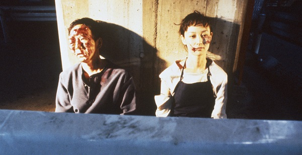 Deux choses à repérer d’entrée. D’abord, c’est la fétichisation du corps du boxeur qui déclenche les festivités : au-delà du désir et du culte du corps, la seule vision du torse nu en sueur de Kojima paraît provoquer chez le couple Tsuda/Hizuru une prise de conscience inédite, celle de leur propre « inhumanité » et de la nécessité de partir à la recherche de leur « corps perdu ». Par ce terme, on fait référence à ce corps que l’on se façonne soi-même pour l’amplifier et pour le singulariser, par le sport ou par les pratiques annexes du body-art (piercing, tatouage, chirurgie…). Ensuite, la seule caractérisation du personnage féminin subvertit cette image de l’épouse passive, idéalisée dans son statut de « meuble décoratif » possédé par le travailleur mâle, telle que le cinéma nippon aime à la représenter ad nauseam. Féministe dans l’âme, Tsukamoto cimente ici un magnifique portrait de femme, faisant d’Hizuru une figure à cheval entre la manipulatrice en mode Verhoeven (celle qui s’émancipe de l’ordre moral par la maîtrise totale de son corps et de ses émotions) et l’oracle révélateur (celle qui amène autrui, au travers de la souffrance et de la douleur partagées, à ressentir des émotions jusqu’ici refoulées). Au terme de ce voyage extrémiste, c’est d’ailleurs elle qui sortira plus forte parce que plus raisonnée à la base. Le temps d’un plan sublime et enveloppé d’une douce lumière blanche qui se passe de commentaires, le visage face caméra de Hizuru épouse alors un état rare de plénitude au milieu d’une décharge publique qui achève sa métamorphose hardcore – beaucoup de brûlures, de piercings et de tatouages. A l’inverse, les deux hommes, trop impulsifs et excessifs dans leur absolu, ressortent de l’expérience avec un visage gravement tuméfié (un œil en moins pour l’un, un faciès déformé à la sauce manga pour l’autre).