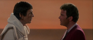 Avec La Colère De Khan, la franchise renoue drastiquement avec ses origines télévisuelles. Ce second film est ainsi la suite d’un épisode de la série télé et surtout met en place le premier chaînon d’un arc narratif qui s’étendra sur trois longs-métrages. Une logique feuilletonesque qui, si elle se montre intéressante sur la durée, va s’accomplir au détriment du fonctionnement des films en tant qu’entités propres. Du strict point de vue de l’histoire, il est déjà pratiquement impossible d’en regarder un sans être passé par ses prédécesseurs. A La Recherche De Spock ne peut être parfaitement abordable que si l’on a vu La Colère De Khan. Pour se prémunir d’un tel problème, Retour Sur Terre débutera même par un montage résumant les deux derniers volets. Toutefois, au-delà de la stricte compréhension de l’histoire, l’intérêt de l’arc narratif ne prend toute son importance que par son tableau général. En effet, sur les trois films, il va se créer un vaste réseau thématique. Cette trilogie au sein de la série va se concentrer sur la fuite inéluctable du temps, la manière d’appréhender une fin inévitable, les conséquences de nos actes, les sacrifices pouvant déboucher sur une renaissance, l’appréhension de notre nature vis-à-vis de notre expérience passée… Sans paraître aussi ouvertement métaphysique que le film de Robert Wise, les péripéties entourant la planète Genesis creusent un sillon passionnant. Mais celui-ci ne peut donc s’apprécier qu’en interconnectant le propos contenu dans chaque épisode. Pris individuellement, ce travail thématique paraîtra incomplet, inachevé et donc insatisfaisant.