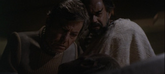 Osons considérer le jugement comme extrême. Celui-ci n’est certes pas sans fondement, ne serait-ce que pour le traitement spirituel du film. Ironiquement, ce qui aurait pu permettre à la franchise de retrouver son sens de la réflexion s’avère l’aspect le plus raté du film. L’embarras causé par la rencontre avec le faux Dieu et son ahurissant « pourquoi Dieu a-t-il besoin d’un vaisseau spatial ? » suffit à résumer la débâcle du discours. Il demeure toutefois une scène maintenant une certaine attention envers le propos. Celle-ci fait d’ailleurs clairement le lien avec le télévangélisme. Sybok (rôle proposé à Max Von Sydow et Sean Connery avant d’échoir à Laurence Luckinbill) a convaincu l’intégralité de l’Enterprise de le rejoindre dans sa quête de Dieu. Seul Kirk, Spock et McCoy résistent encore et toujours à l’envahisseur vulcain. Sybok les soumet alors à son pouvoir qui demeurait évasif jusqu’à présent. Il met ses « victimes » face à leur angoisse profonde et leur apporte une solution pour les en libérer. Ce à quoi Kirk répond qu’il refuse de s’en séparer car elle constitue une part de sa personnalité. Bref, la séquence détaillant les tourments des personnages ramène à certaines dérives religieuses apportant une réponse trop facile et donc non viable aux tourments de notre existence. Seule cette scène laisse entendre clairement des intentions qui prendront des formes grotesques dans le reste du long-métrage.