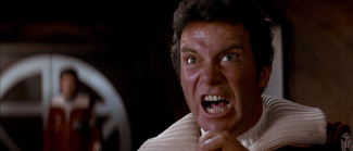 Malgré toutes ses thématiques, La Colère De Khan se veut avant tout un divertissement plus direct et entraînant. Pour satisfaire cela, Meyer choisit ainsi de représenter l’univers par des artifices succincts à l’efficacité exemplaire. Wise prenait tout un acte pour introduire l’équipage. Meyer utilise son plan d’ouverture pour resituer immédiatement la place de chacun. Chez Wise, on s’interrogeait à foison sur la nature de l’antagoniste. Ici, on laisse le bad guy expliquer lui-même ses origines et motivations par des monologues où éclate sa nature extravagante. Khan est d’ailleurs l’une des grandes qualités du film et la raison pour laquelle le film est profondément admiré par les fans. Il est assez difficile en voyant le film de croire que Ricardo Montalban hésitera à reprendre le rôle. Après des années à jouer le gentil hôte de L’Ile Fantastique, il se voyait mal se replonger dans un tel méchant. Il offrira pourtant une prestation endiablée faisant ressortir la folie d’un homme qui a passé trop de temps à lire Moby Dick et Le Roi Lear. La grandiloquence du personnage donne toute sa saveur réjouissante à son affrontement avec Kirk. Cette bataille entre les deux hommes n’est d’ailleurs pas tant une démonstration pour savoir qui est le plus grand stratège qu’un pur combat d’égos. Meyer apporte certes un soin aux batailles spatiales, calquant celles-ci sur des stratégies de combats navals (il s’inspirera notamment de Capitaine Sans Peur et de Torpilles Sous L’Atlantique pour leurs constructions), mais le cœur du duel se situe avant tout dans l’obsession des adversaires l’un envers l’autre. Tel Achab, Khan n’a d’autre but que la destruction de sa baleine blanche quitte à sacrifier son équipage pour y arriver. Quant à Kirk, il refuse purement et simplement que les choses n’évoluent pas comme il le désire. Par cet aspect se dessinent ainsi les fondements narratifs de l’histoire à venir.