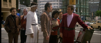 Quitte à envoyer du lourd, il fut d’ailleurs envisagé un temps que les membres du casting soient associés avec Eddie Murphy. L’acteur venant d’exploser avec Le Flic De Beverly Hills, la Paramount voyait là l’opportunité de fusionner ses deux franchises les plus lucratives. Murphy prend toutefois d’autres engagements, évitant ainsi de devenir à Star Trek ce que son idole Richard Pryor fut à Superman. Le soin est laissé aux autres acteurs de mener la comédie. Et il faut admettre qu’ils se débrouillent avec un certain enthousiasme. Tellement habitués à leurs personnages, ils arrivent sans sourciller à créer les réactions les plus justes à la découverte d’un monde antique à leurs yeux. C’est bien cette justesse qui donne toute sa saveur aux différents gags : l’équipage s’offusquant de l’utilisation stupide d’argent pour toute transaction, McCoy se scandalisant de la médecine barbare du XXème siècle, Scotty tentant de faire marcher un ordinateur en parlant dans la souris, Spock essayant de se conformer aux métaphores pittoresques constituant le langage des autochtones. Revenu au poste de scénariste, Nicholas Meyer en profite même pour inclure une idée coupée au montage de C’était Demain où H.G. Wells se retrouvait confronté à un punk dans un bus. Si la comédie reste bon enfant, il faut au moins admettre qu’elle fonctionne même si l’ancrage dans son époque a réduit l’impact de certains gags (Kirk parlant dans ce qui ressemble à un pager, Chekov demandant avec son gros accent russe où il peut trouver une centrale nucléaire). Cela tend à rappeler l’intérêt demeurant limité du film.
