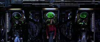 Les présentations sont faites, place désormais à l’action. Et le moins que l’on puisse dire, c’est que Premier Contact frappe fort en ce sens. A l’instar de La Colère De Khan, l’idée de ce huitième épisode est de confronter l’Enterprise à un vieil adversaire : les borgs dont la doctrine est « toute résistance est inutile ». Cette race extraterrestre est en effet pour le moins pernicieuse. Elle n’existe que dans le but d’assimiler les espèces qu’elles croisent. Les borgs s’apparentent à l’antithèse ultime de Starfleet, son reflet sombre. L’organisation a toujours été marquée par le respect entre les peuples et son refus d’influencer leur développement (il s’agit de leur directive première). Les borgs ne veulent que normaliser tous les individus selon un modèle unique. L’ennemi est donc pour le moins terrifiant, surtout qu’il adopte une esthétique biomécanique. Pour inspirer son travail de réalisateur, l’acteur Jonathan Frakes se penchera d’ailleurs particulièrement sur les deux premiers épisodes d’Alien. Pas un mauvais choix d’étude, surtout lorsque la production envisage un temps de confier la réalisation à Ridley Scott. Le cinéaste anglais refusera, tout comme John McTiernan également contacté. Une option retenue probablement pour l’aspect Piège De Cristal de l’intrigue, Picard tentant de survivre en se cachant dans les coursives et conduits d’aération du vaisseau alors que les borgs l’envahissent.