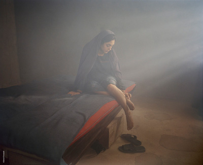 Le bleu de la chambre, c’est le bleu de la majorité des voiles des femmes afghanes. C’est une couleur qui me plaît en ce sens qu’elle semble communiquer les rêves de ces femmes que ce vêtement, pourtant, masque à notre vue. Or cette chambre, pour moi, c’est un peu ça aussi : à la fois une prison et le lieu où le personnage exprime ses aspirations. L’héroïne y regarde à travers les motifs brodés des rideaux comme elle regarde à travers la « grille » de sa burqa…