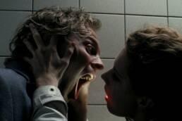 BF : L’utilisation du gros plan, je pense qu’elle a aussi quelque chose à voir avec la notion d’intimité, surtout celle que tu peux avoir en tant que spectateur avec le personnage. Cela permet de filmer le corps humain comme un paysage, et c’est d’ailleurs quelque chose que j’adore dans certaines scènes de meurtre propres au giallo. Tout à coup, tu as l’espace qui est cassé par le gros plan, notamment dans Suspiria… même si ce n’est pas vraiment un giallo ! (rires) On se sert justement de ce jeu avec le gros plan pour « casser le corps » et en faire quelque chose de plus abstrait. Et bien sûr le choix du Scope participe aussi à cela : on utilise en général ce format-là pour mettre en valeur des paysages, et là, c’est le corps lui-même qui devient un paysage.