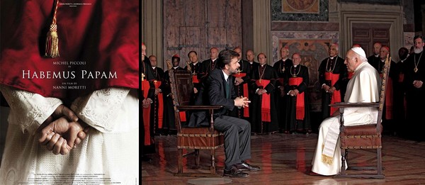 Le film ne dira pas plus que ce qu’il montre, cherchera bien moins l’implicite que les précédents opus de Moretti, ne nous réservera pas de verve semblable à celle que l’on pouvait attendre. Il marquera néanmoins durablement par des images folles, empreintes d’une poésie singulière dont le cinéaste garde le secret depuis ses débuts : des cardinaux disputant une partie de volley dans la cour du Vatican, un tel se faisant expliquer par un psychanalyste en quoi la Bible est fondamentalement un livre sur la dépression ou tel autre réclamant une permission de sortie en promettant de rester joignable avec son portable alors que l’élection n’a pas été publiquement annoncée ! Et surtout cette séquence du vote qui débute dans l’obscurité d’où peuvent émerger les pensées intimes de chacun : Moretti fait se superposer les prières intérieures des cardinaux atterrés à l’idée d’être élu pape, jusqu’à saturer la bande-son d’une véritable cacophonie. Suite à la fuite du pape en proie au doute, deux films se répondent l’un à l’autre : l’un, pure farce morettienne, avec le narcissique réalisateur en psy’ du conclave ; l’autre, mélancolique, avec le formidable Michel Piccoli errant en quête d’une passion réelle qui s’avérera bien vite être celle qu’il avait pour le jeu d’acteur et pour les pièces de Tchekhov. La séquence de sa psychanalyse à lui, où il se présente comme un acteur vieillissant, nous submerge d’émotion sans crier gare, par sa beauté simple et tranquille. Si aucune ire vaticaniste n’est venu frapper Moretti, c’est peut-être qu’il touche du doigt un état de fait : les cardinaux et celui d’entre eux qu’ils élisent ne sont-ils pas de vieux messieurs en proie comme tout un chacun au doute et coupés du monde au point de retrouver une certaine naïveté (magnifique séquence où tous dansent sur une ballade de Mercedes Sosa, « Todo cambia », comme s’il s’agissait de la première musique, miraculeuse, qu’ils entendent) ? En prise avec un monde des sentiments qu’il aimerait pénétrer mais dont il n’a pas la clef, le pape Piccoli serait une figure morettienne typique – quelque grand-oncle du prêtre de La Messe est finie (1986) -, en tout cas l’une des plus émouvantes.
