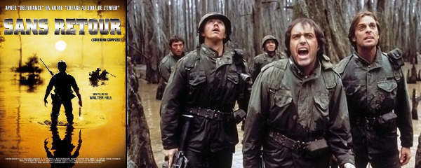 Un choix géographique qui donne au film une dimension métaphorique plus qu’évidente, reproduisant ainsi le cadre du Vietnam dans un décor tout aussi exotique et dangereux. Et si le film de John Boorman faisait de la nature une vue de l’esprit idyllique progressivement vérolée par les bas instincts de l’être humain, Walter Hill opte au contraire pour un lieu d’emblée inhospitalier, sorte de bourbier gavé de pièges mortels dans lequel des personnages plus antipathiques qu’autre chose s’immiscent à la manière de conquérants sans pitié. Du coup, les soldats sont ici décrits comme des abrutis complets, d’une bêtise parfois hallucinante (l’un d’eux avoue vendre de la drogue à des mioches de dix ans !) qui n’a d’égal que leur profond mépris des peuples indigènes, et contraints de rester unis pour survivre alors que de violentes tensions s’installent très vite entre eux. Quant aux représentants de la culture « white trash », Hill ne les peint en aucun cas comme des tarés congénitaux sodomisant les pauvres citadins égarés en territoire inconnu, mais davantage comme les pauvres victimes d’une Amérique vaniteuse et imbue d’elle-même. Ce renversement total des codes du genre sied à merveille au style enragé de Walter Hill, lequel prend soin d’en pousser les limites, forçant ainsi l’identification du spectateur à une bande d’imbéciles en uniforme et plaçant ainsi celui-ci face ses responsabilités morales et politiques. Assez inconfortable sur le fond, Sans retour n’en oublie toutefois pas d’être ce qu’il devait être avant tout, à savoir un pur survival d’une efficacité et d’une colère assez étonnantes, réalisé de façon sèche et sans aucun compromis par un cinéaste en pleine possession de ses moyens, et dont le scénario, précis comme la balle d’un fusil, maintient une tension incroyable de la première à la dernière seconde. De quoi s’attrister qu’un film aussi puissant n’ait pas réussi à trouver le succès dans les salles obscures. Cela dit, Walter Hill n’aura pas attendu bien longtemps pour sortir de cet échec : l’année suivante, il réalisera 48 heures, buddy-movie avec Nick Nolte et Eddie Murphy, qui sera le plus gros succès de sa carrière.
