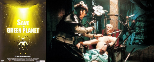Si l’on peut reprocher quelque chose à nos amis sud-coréens, c’est d’avoir bâti leur récente industrie cinématographique sur la volonté de tenter un peu tout et n’importe quoi, d’embraser tous les genres sans forcément les maîtriser, et de chercher parfois à reprendre les ficelles du cinéma américain par pur souci d’engranger de la thune facile sans trop se fouler les neurones. Et au beau milieu d’un océan de nanars prétentieux avaient alors réussi à surnager quelques uppercuts signés Bong Joon-ho ou Park Chan-wook, paradoxalement les seuls à flatter les festivaliers et à bénéficier donc d’une large couverture médiatique. Du coup, en creusant davantage, on pouvait parfois tomber sur des ovnis complètement lézardés de la cafetière dont Save the Green Planet reste peut-être le fer de lance. Sorte de rollercoaster totalement improbable, passant d’un genre à l’autre avec une dextérité hallucinante, le film de Jeong Jun-hwan constitue donc une alternative originale qui cherche d’abord à faire mine de partir dans tous les sens pour mieux scier le cortex de son spectateur lors de son final ubuesque lorsque le véritable propos du film se voit soudain clarifié. Pour schématiser, disons que ce gros portnawak part d’un kidnapping insensé, celui d’un homme d’affaires richissime que son kidnappeur timide et parano (également l’un de ses anciens employés) soupçonne d’être un extraterrestre planifiant en secret la destruction imminente de la Terre ! Mais ce pitch frappadingue, d’autant plus absurde qu’il s’étoffe de personnages bien déjantés (dont une complice débile et un inspecteur déchu réduit à faire la cuisine pour ses supérieurs) et d’idées de gags qui le sont autant (on en apprend beaucoup sur les ingrédients d’une crème de massage !), ne réussit pas pour autant à dissimuler son véritable propos : les cinéphiles habitués à ne voir dans ce genre de portnawak qu’une mise en bouche préparant à quelque chose de surprenant ne mettront pas moins d’une demi-heure pour deviner le twist final, lequel fait vriller alors le thriller comico-horrifique vers de la science-fiction quasi comic-book. Malgré tout, ces audaces narratives n’entachent en rien la cohérence du film, certes zébré ici et là de quelques hommages appuyés à Maniac, Reservoir Dogs ou 2001 : l’odyssée de l’espace, mais profondément intègre dans ses velléités humanistes comme dans son traitement d’un sujet plus sérieux qu’il n’y parait. Aussi inclassable que fortement recommandable, donc.