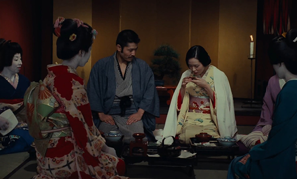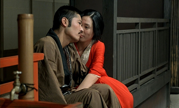 Quel titre convient le mieux à ce film ? On peine à faire un choix définitif, surtout au vu de ce que l’on vient d’évoquer sur le contenu du film. Le titre original, que l’on peut traduire par « Corrida de l’amour », suit bien cette lecture d’un amour fou qui s’isole et qui repousse en huis clos ses propres limites jusqu’à l’épuisement et la mort. Mais à bien y réfléchir, le titre français possède un impact bien plus soutenu. En effet, le mot « empire » implique l’idée d’une domination, d’un règne absolu qui s’affranchit du jugement d’autrui et des conventions – définition idéale du stade terminal de l’art selon Oshima. Un empire obéissant par définition à ses propres règles, le couple qui le circonscrit n’est alors rien de plus qu’une entité autonome, marginale et détachée du corps social. Mais la chambre qui abrite les ébats sexuels ne devient pas pour autant une cachette ou un cocon protecteur. Quitte à aller peut-être un peu loin, cette chambre devient en quelque sorte le centre du monde, un spectacle offert à la vue de tout le monde (surfaces murales transparentes, intérieurs japonais sans insonorisation, parapluie troué qui révèle l’intimité) et qui éjecte tous ceux qui tentent de rentrer en contact avec les amants (il suffit de voir comment les servantes sont systématiquement éjectées de la chambre). L’effet qui en résulte est sacrément retors : ceux qui assistent à ce spectacle ne sont choqués que parce qu’il ravive les désirs interdits qui les tenaillent.