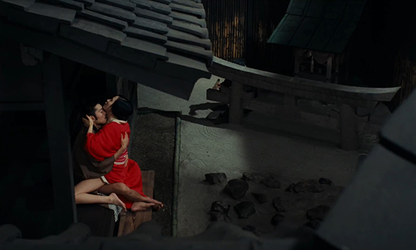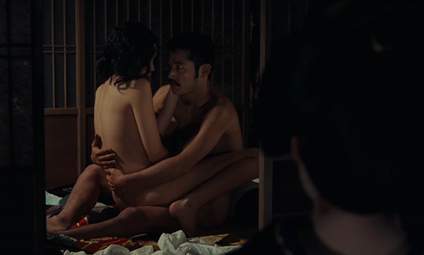 Si scandale il pouvait y avoir dans L’Empire des sens aux yeux de la censure japonaise, c’était sans aucun doute le fait de voir – et aussi d’envisager – le corps social contaminé par l’interdit. Une scène précise du film illustre ce fait sans pour autant le juger : alors que Sada est dépucelée par Kichizo dans un salon, les geishas qui observent le couple pratiquent une pénétration forcée sur une jeune et vierge geisha (avec un moineau en bois en guise de godemiché !), et ce avant que la salle entière ne vire à la partouze tandis que le maître du cérémonial entame une danse bizarre. Sous l’effet d’amants à ce point chatouillés par leurs pulsions jusqu’à vouloir à tout prix fouiller les entrées de leurs kimonos, les jeux de l’interdit se propagent alors tout au long du film, souvent avec un vrai sens de l’humour. Petit pêle-mêle : Sada enfourche Kichizo pendant l’acte sexuel tout en jouant de la guitare (soi-disant pour tromper la surveillance de l’épouse !), Kichizo mange plein d’aliments (des algues, des sushis, un œuf…) après les avoir « humidifiés » dans le vagin de Sada, Kichizo boit le sang des règles de Sada (ce qu’elle interprète comme une preuve d’amour fusionnel), on en passe et des meilleurs… A l’image de Sada elle-même, la caméra d’Oshima filme tout cela avec un art consommé du « trou de serrure » : le cadre est fixe, aussi pur et épuré que chez Ozu, mais placé soit au plus près des corps en fusion, soit à distance des actes sexuels qu’il visualise au travers d’un élément de décor (mur opaque, tissu vaporeux, embrasure d’une porte…).