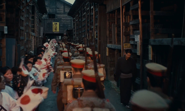 Et le discours, alors ? De par le cérémonial sensuel et morbide qui architecture à lui seul toute la mise en scène d’Oshima, le seul discours qui prend place ici est un discours sexuel. Les dialogues sont en effet brefs, en pointillés, laissant ainsi le spectateur plus à même de voir et de ressentir les choses par l’image plutôt que de les assimiler par le son des mots – quoi de mieux pour lui rendre sa liberté et son intimité ? Mais il n’en reste pas moins qu’au travers de son action et du passé de son réalisateur, L’Empire des sens reste un film éminemment politique. Outre le fait de montrer une geisha qui prend le pouvoir sur son maître par sa lecture mystique de l’amour fou (Oshima serait-il un féministe inavoué ?), ce plan mémorable de Kichizo qui marche à contre-courant des soldats japonais qui se lancent dans le conflit guerrier a surtout pour but de produire un effet de sympathie hautement subversif envers les deux amants. Pour faire lien avec l’actualité ciné mais aussi avec l’époque à laquelle se déroule l’intrigue, on pourrait trouver là une connexion directe avec le très beau film d’animation de Sunao Katabuchi, Dans un recoin de ce monde (en salles le 13 septembre), où la quête de vie et de survie du collectif dans une petite ville du Japon prenait le dessus sur les considérations guerrières et politiques, alors bloquées dans le hors-champ ou dans l’arrière-plan.