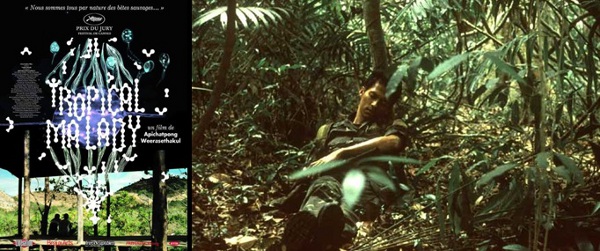 Récompensé par un Prix du Jury au festival de Cannes en 2004, Tropical malady poursuit la thématique du désir et du souvenir entamée par Apichatpong Weerasethakul dans son précédent film, et accentue davantage cette diffraction des sens à travers une histoire à deux faces, l’une réaliste, l’autre mythologique. Il y sera d’abord question de deux jeunes hommes, vivant une romance dans le Bangkok contemporain, puis d’une chasse à l’homme silencieuse et hypnotique dans une jungle aux accents fantasmagoriques. Reliées par un trou noir scénaristique renvoyant aux cassures narratives du cinéma de David Lynch, le film élabore un double programme qui remet en question notre rapport aux images et joue sur nos perceptions de bout en bout jusqu’à un final inoubliable. Aussi contemplatif que déroutant, dévoré par un mystère jamais révélé, le film est surtout une authentique séance d’hypnose dont les effets secondaires procurent une longue et délicieuse transe. Sans aucun doute l’un des films les plus importants des années 2000.