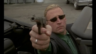 L’histoire en elle-même est mince : deux vendeurs de voitures d’occasion pratiquement ruinés acceptent de garder une mystérieuse Pontiac contre une rémunération substantielle. Le hic, c’est que tous ceux qui se sont accaparés le véhicule meurent les uns après les autres. On retrouve l’idée de mixer les genres (film de gangster, comédie, drame, etc…) avec des grands écarts d’humeur en alignant humour noir (les morts à la chaîne de l’ouverture) et patine référentielle (l’engueulade autour de l’homosexualité de Johnny Cash). La patte tarantinesque se sent également dans un récit éclaté où se multiplient les personnages ayant une grosse tendance à jacasser pendant que passe en fond sonore de la musique rétro. Assuré par Carnahan lui-même, le montage joue de son côté la carte de la non-linéarité. Il ne s’agit pas là de rompre la chronologie de l’intrigue façon Reservoir Dogs mais de rajouter au milieu des scènes des quantités astronomiques d’inserts surlignant ce qui se dit.