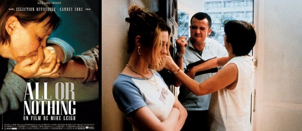 Après une incursion dans la fresque historique avec le surprenant Topsy-Turvy, Leigh revient à la chronique sociale du quotidien de ses compatriotes qui a fait sa renommée. All or nothing est présenté en compétition au festival de Cannes en 2002 et salué par la presse, notamment pour les prestations admirables de ses comédiens, mais repart bredouille de la Croisette comme, plus tard et plus injustement encore, Another Year. Dans ce qui semble être le parfait opposé du Londres que l’on a l’habitude de voir au cinéma, le cinéaste met en scène une galerie de personnages qu’interprètent quelques uns de ses comédiens fétiches : Timothy Spall, Lesley Manville, Ruth Sheen, Sally Hawkins, etc. Tous se croisent jour après jour dans la cour de leur immeuble de banlieue. Les temps sont durs et chacun encaisse comme il peut, un tel en s’enfermant dans le mutisme voire l’apathie, tel autre en explosant sans cesse de manière tonitruante. La faute, peut-être, à l’impossibilité d’un intermédiaire entre ces deux états radicalement opposés. Peu à peu, on finit par saisir que si les personnages se répandent sans cesse en insultes, même vis-à-vis de leurs plus proches parents, ou se résignent à fuir toute vraie discussion, c’est parce qu’ils ne savent fonctionner autrement et trouver les mots justes pour exprimer leurs sentiments. On retrouve ici l’un des grands thèmes du cinéma de Leigh : cette impossibilité des individus à communiquer que déterminent largement des facteurs sociaux. Ici, cette incommunicabilité ne se manifeste plus dans des tics incessants ou de longues plages de silence comme dans Bleak Moments ou Deux Filles d’aujourd’hui mais par la parole elle-même, maladroite et violente.