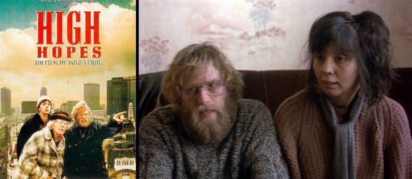 C’est après plus de quatorze années passées à réaliser des films pour la télévision que Mike Leigh revient enfin au cinéma, étant parvenu à retrouver chez Channel 4 la confiance de producteurs qui l’aident à financer un deuxième long-métrage, sorti en 1988 et salué à la Mostra de Venise, High Hopes. Tout est dans le titre, semble-t-il : le nouveau départ du cinéaste qui ne s’arrêtera plus, désormais, de tourner, mais également ces « grands espoirs », ces idéaux politiques et sociaux des personnages du film. Leigh observe ces derniers dans leurs tentatives de dépasser leur condition, de toucher à ces buts matériels qu’ils se fixent ou simplement de sentir encore prégnantes en eux les idées qui les ont animés dans un temps plus ou moins reculé. Il y a d’abord Cyril et Shirley (Ruth Sheen), un couple de baba-cools vivant dans le culte de Marx. Puis, Valerie, la sœur de Cyril, et son mari Martin, qui cherchent vainement à s’élever dans l’échelle sociale. Enfin, Laetitia (Lesley Manville) et Rupert Boothe-Braine, de nouveaux riches investissant le quartier londonien jadis populaire où Mrs Bender (Edna Doré), la mère de Cyril et Valerie, vit dans le dernier council flat du coin – l’équivalent britannique des HLM français. Délaissée par les siens, la vieille dame silencieuse paraît observer d’un œil amer, désabusé, cet entourage qui stagne ou, au contraire, s’agite.