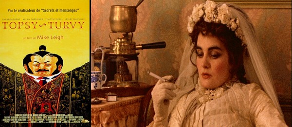Londres dans les années 1880. W.S. Gilbert et Arthur Sullivan, dont les opérettes n’ont jamais connu d’échec, sont les maîtres incontestés du théâtre musical dans l’ensemble du monde anglo-saxon. Mais leur dernière pièce reçoit un accueil mitigé de la part de la critique et du public. Découragé, Sullivan (Allan Corduner) souhaite désormais se consacrer à la musique « sérieuse ». Gilbert (Jim Broadbent) doit, lui, absolument trouver une nouvelle idée pour le directeur du Savoy Theater avant que sa carrière ne soit ruinée… Mike Leigh s’essaye pour la première fois au film en costumes dans la plus pure tradition britannique. Ou presque, puisque c’est sans surprise qu’il s’approprie le genre. En ce duo que forment le compositeur et le dramaturge, il trouve des alter-egos qui lui permettent d’évoquer le processus de création, les motivations et les doutes de l’artiste. Plus de 2h30 durant, on suit les protagonistes presque uniquement en intérieurs : dans leurs couples comme au théâtre, la routine est installée, et l’inspiration, quand elle est là, vient des liens interpersonnels ou de la visite d’une exposition folklorique japonaise. On note que l’unique scène en extérieurs, où Gilbert fuit le théâtre pendant une représentation dans les ruelles sombres de Londres, est aussi pittoresque que le reste, comme si la maîtrise et la stylisation artistiques propres à l’espace théâtral débordaient des limites de ce dernier.