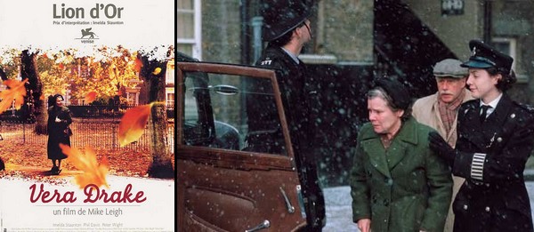 Vera Drake sourit sans cesse, même dans le Londres misérable des années 1950, encore hanté par le démon de la guerre, même aux hommes les moins affables. Ses « dear » mille fois répétés ressemblent aux « sweatheart » de l’héroïne de Secrets et Mensonges mais Vera a assurément plus d’aplomb que Cynthia. Son quotidien, dont la narration et le montage de la première demi-heure du film suffisent à nous dire à quel point il est réglé, semble lui convenir parfaitement. Qu’elle cuisine pour son mari et ses deux grands enfants, qu’elle rende visite à sa mère grabataire, qu’elle astique les meubles des bourgeois qui l’emploient et la regardent à peine ou qu’elle croise quelque voisin morose, elle chantonne sans cesse et propose du thé à tout-va. Au détour d’une scène, on s’en rend à peine compte, mais l’eau qu’elle fait chauffer dans une cuisine sombre ne finira pas dans une théière mais, une fois du savon dissout dedans, dans le ventre d’une femme suppliante et terrifiée qui implore son aide. Vera est avorteuse. Ce qu’elle fait est illégal mais elle le fait quand même, sans rien demander, simplement pour aider qui le lui demande, par l’intermédiaire de son amie d’enfance Lily (Ruth Sheen). Elle n’est pas naïve mais, en bonne héroïne flaubertienne (comme dans Un Cœur simple), elle le paraît à force de bonté et en comparaison avec les bassesses des hypocrites et des puissants.