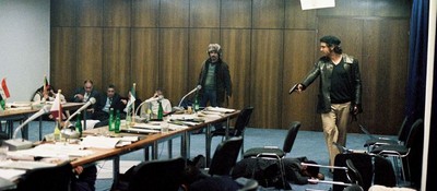 Ainsi, la fiction n’est jamais rétrécie par le souci factuel et l’absence de recul vis-à-vis de ces données géopolitiques complexes et multiples. Le film est toujours dans le présent, l’agitation des corps. L’Histoire avec un grand H, l’agencement complexe des rapports de force entre l’Est et l’Ouest, à la fin de la guerre froide, les relations Nord-Sud, le jeu des grandes puissances, l’importance stratégique du pétrole, tout cela est mis à plat à mesure que le film avance et sert de théâtre à l’action du personnage. Les bouleversements de l’histoire éclairent les paradoxes de Carlos par la manière dont il leur répond ou dont il les subit (la version cinéma explicite très clairement par un montage implacable l’impact de la fin de guerre froide sur le terrorisme de Carlos : une scène le voit recevoir le soutien financier et la protection de la Syrie, des archives montrent la chute du mur de Berlin, puis on revient en Syrie où Carlos est gentiment invité à quitter le territoire : il est devenu un parasite inutile). Le film, et particulièrement la version TV (presque toute la période entre la prise en otage des membres de l’OPEP et le déclin de Carlos est coupée au montage cinéma, alors qu’elle montre les contradictions du personnage, qui crée sa propre organisation et court après l’argent et la renommée), fournit ainsi une fine réflexion sur le déclin de l’idéal révolutionnaire. Le péché de Carlos, c’est d’accepter de l’argent plutôt que de se sacrifier pour la cause ; ce pacte capitaliste le condamne à l’errance, star encombrante d’une révolution dont plus personne ne veut. Il passe à un mercenariat cynique qui a prospéré pendant des années où l’on pouvait maquiller l’appât du gain en un vague discours politique, aussi confus qu’insupportable. Celui des années de plomb !