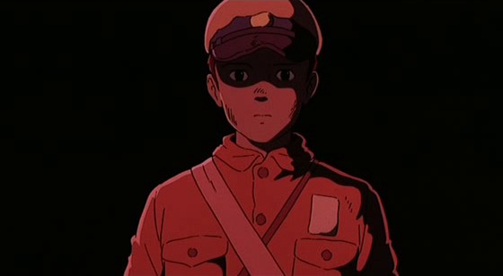 A un unique moment, le cinéaste délaisse néanmoins ce point de vue des deux enfants ou de leurs fantômes : lors du bombardement de Kobé, au début du film. Il y a d’abord ces plans aériens sur les avions américains, qui figurent une ampleur des évènements que Seita et Setsuko ne peuvent saisir, qui les dépasse. Et puis il y a ces images du désastre, ces vivants qui hurlent face aux flammes qui les encerclent et ces morts entassés. En un plan, le militarisme nippon est dénoncé par Takahata comme étant lui aussi à l’origine de la catastrophe : au premier plan, femmes et enfants sont recroquevillés, tandis qu’à l’arrière-plan, un homme en uniforme militaire brandit son sabre et crie « Vive l’Empereur ! » comme s’il était prêt à repartir immédiatement au combat, peu importent les centaines de milliers de morts que les bombardements viennent de causer, peu importe l’anéantissement quasi-total de l’armée et de la flotte japonaises. La force du film est de continuer de montrer l’impact de la guerre sur la population mais à un niveau plus intime, qui évoquerait presque Pluie noire de Shohei Imamura, sorti un an plus tard au Japon. L’exaltation de la patrie et la croyance naïve en une victoire encore possible, on les trouve également chez Seita, fils d’un officier dans la marine. Face à un quartier entier réduit à un tas de cendres, tout ce qu’il dit à sa petite sœur c’est : « Ne t’inquiètes pas, papa nous vengera ». Plus tard, on le verra lire un livre exaltant visiblement la puissance militaire du pays et on l’entendra chanter une marche militaire en imaginant que les lucioles qu’il a faites entrer dans la moustiquaire de son lit dessinent la forme des bateaux de la revue navale après laquelle son père est parti à la guerre. Mais, comme il en prendra violemment conscience en apprenant après tout le monde la capitulation du pays, Seita est en décalage avec le réel à force de l’être avec la société…