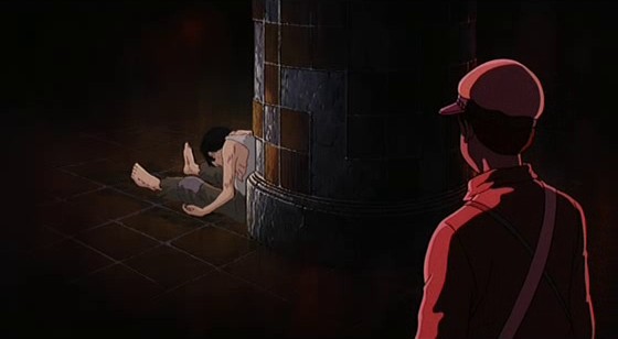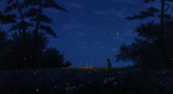 « La nuit du 21 septembre 1945, je suis mort ». C’est par cette phrase terrible que le silence des premières secondes du film est brisé. De même, de la nuit noire qui emplissait préalablement l’écran, la silhouette d’un garçon s’extrait. Elle est presque monochrome, d’un rouge profond qui lui donne l’air irréel. Bien qu’il soit presque masqué par l’ombre de la visière de sa casquette, on devine le regard du personnage, dirigé hors-champ. Le plan suivant nous révèle l’objet de ce regard : un pilier en béton et une petite fontaine, plongés dans la pénombre. Mais la fontaine disparaît immédiatement et l’état du pilier se dégrade en même temps que l’éclairage change pour lui donner non plus des couleurs rougeoyantes mais grisâtres. Un corps apparaît, appuyé contre le pilier. Un troisième plan vient réunir le regardant et le regardé. Le premier et le deuxième garçons ne sont qu’une seule et même personne. L’esprit de Seita se repenche sur son passé et regarde sa propre mort. Celle-ci se fait sous nos yeux à nous aussi, dans des couleurs froides, aussi livides que le teint du garçon, comme vidées de leur substance. Un travelling qui nous détaille le corps extrêmement faible de Seita, son visage moribond, confirme la crudité de la situation décrite comme réelle. D’ailleurs, le corps affalé ne tarde pas à retrouver un contexte : un hall de gare, des passants dont le visage demeure hors-champ parce qu’ils sont soient indifférents, soit offusqués par l’agonie de ces orphelins qui, à leurs yeux, ne font que couvrir le pays de honte. En un gros plan qui fait l’effet d’un couperet, le garçon s’éteint avoir murmuré un ultime nom : Setsuko. La petite fille ne tardera pas à apparaître à son tour. Lorsqu’un employé de la gare trouve dans la poche de Seita une vieille boîte de bonbons métallique, il la jette derrière au loin, dans l’herbe, derrière le bâtiment. Quittant symboliquement l’antre de la mort, la boîte « revient à la vie » : en même temps que de petits morceaux d’ossements, des lucioles s’en échappent et bientôt l’âme de Setsuko qui s’émerveille de la myriade de points lumineux qui forment comme des étoiles folles. Lorsque Seita ramasse la vieille boîte de bonbons, celle-ci retrouve miraculeusement son éclat pour faire le bonheur de Setsuko.
