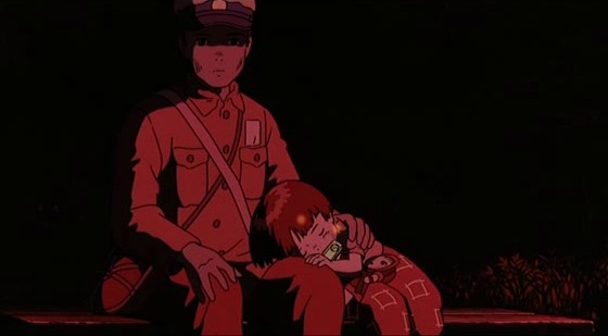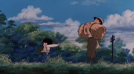 Cette auto-exclusion des personnages de la société sera explicitée, lorsqu’un paysan à qui ils demandent à manger leur explique qu’avec des rationnements de plus en plus durs, on n’a plus rien à manger en dehors de la communauté. Les quelques scènes qui renvoient Seita à la maladresse de son choix d’isolement sont terribles : il y a d’abord cet après-midi où plusieurs gamins du coin passent devant l’abris des protagonistes pendant l’absence de ces derniers et n’en croient pas leurs yeux, trouvant des grenouilles séchées et autres aliments qu’ils n’accepteraient jamais d’ingurgiter, même en ces temps difficiles, à la maison. Ce sera le premier et unique point de vue que le film montrera sur l’abri en dehors de celui de ses deux habitants, et le manque de compassion des gamins nous révolte. Mais là encore – et c’est tout l’impact dévastateur du film de Takahata – on ne saurait accabler ces personnages, les désigner comme « méchants » aussi rapidement qu’on a l’habitude de le faire face à la plupart des films visant un jeune public. L’enfance, son insouciance, sa naïveté rendent en partie compréhensible une telle réaction, de même qu’elles excusent les décisions parfois étonnantes de Seita. Quant à la violence de certains personnages adultes (physique pour le paysan volé, symbolique pour les passants méprisants du hall de gare de l’ouverture), elle paraît devoir beaucoup, aussi, au regain d’individualisme et de mépris des autres qu’amènent fatalement le rationnement et les autres épreuves du direct après-guerre. La seule chose à laquelle on puisse réellement s’en prendre, au final, c’est donc bien la guerre elle-même. En ce que l’on est amené à ce constat basique par une multitude de petits détails du film sans que celui-ci n’ait à aucun moment l’air de verser dans le réquisitoire ou la réflexion transcendante, Le Tombeau des Lucioles est bien l’un des plus grands films antimilitaristes de l’histoire du cinéma.