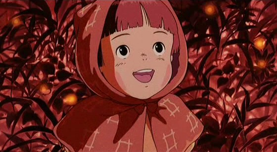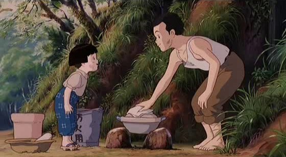 Vers la fin du film, Seita prépare la crémation de Setsuko et observe une famille visiblement aisée qui revient heureuse dans sa maison après avoir apparemment fuit les bombardements pendant des mois. Tandis que les filles de la famille écoutent un disque et se penchent par la fenêtre de leur maison, un travelling nous porte sur l’autre rive de l’étang que l’on voit depuis leur fenêtre, sur laquelle se trouve… l’abri de Seita et Setsuko, tout juste abandonné. Que dire de cette séquence, sinon que là encore – et plus jamais même, Takahata exprime en silence et avec une puissance inouïe la quasi-inconcevabilité d’un destin aussi tragique que celui raconté ici. Comment le retour à la vie paisible d’une famille et la crémation d’une fillette de quatre ans morte des suites d’une malnutrition peuvent-ils coexister à une distance de quelques centaines de mètres ? La douce musique du disque qu’écoutent les jeunes filles aisées est prolongée le temps d’une séquence comme en suspens où, dans l’abri délaissé, étrangement calme sous le soleil de l’après-midi, l’image de Setsuko reste comme imprimée. On devine que ce à quoi on la voit s’affairer (de purs jeux d’enfant ou des imitations des tâches ménagères d’une maman) était certainement ce qu’elle faisait pendant que Seita la laissait seule. Les larmes qui coulaient déjà depuis un bon bout de temps sur nos joues deviennent alors incertaines, à la fois d’attendrissement profond et de tristesse immense. L’enchantement de ce moment n’efface pas la dureté presque insoutenable du spectacle de la mort d’un enfant dont on a fait l’expérience quelques minutes plus tôt (et dans ce moment-là, l’animation n’offre plus aucune « protection émotionnelle »). Mais là encore, c’est en fait du mariage des deux que naît la vraie émotion, de celle qui vous vide entièrement et ne laisse ensuite vous envahir doucement qu’une reconnaissance immense envers un cinéaste capable de cela.