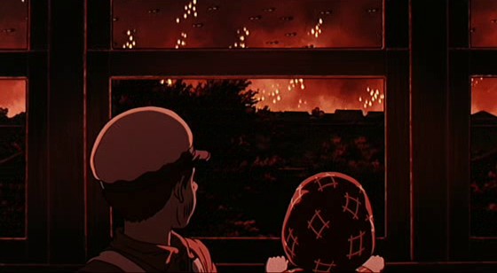 Au printemps 1945, la reconquête du Pacifique par les troupes américaines est achevée. On garde en mémoire la violence de films comme La Ligne rouge de Terrence Malick (1999) ou le diptyque Mémoires de nos Pères / Lettres d’Iwo Jima de Clint Eastwood (2006/2007) qui évoquent ces batailles. Les pertes sont énormes des deux côtés, mais les Japonais montrent une ferveur nationaliste impressionnante, notamment à Okinawa, première île stratégique de l’archipel nippon sur laquelle débarquent les Américains, où même les écoliers préfèrent se suicider à la sortie des classes que de supporter la présence de l’ennemi. Si l’avancée des troupes prend plus ou moins fin à ce moment-là, une série de bombardements débute en mars. Ce seront les plus meurtriers de l’histoire. A Kobé, grand port industriel et militaire et donc cible privilégiée, les constructions de papier et de bois, destinées à limiter les pertes en cas de séisme, sont anéanties par une pluie de bombes incendiaires. Près d’un quart de la ville est détruit. Moins de six mois plus tard, le Japon capitule. L’action du Tombeau des Lucioles se déroule approximativement entre ces deux dates clé : le bombardement de Kobé ouvre le long flash-back qui occupe la quasi-totalité du métrage, et la capitulation japonaise est évoquée en fin de métrage lorsque Seita l’apprend un peu tard. Pour être plus précis, la seconde borne temporelle du film est le jour où fut décrété le « Plan général pour la protection des orphelins de guerre », le 20 septembre 1945, soit exactement la veille de la mort de Seita. Ce détail, présent dans la nouvelle de Nosaka, est d’une ironie extrêmement sombre qui ne rend que plus révoltante l’histoire des deux enfants.