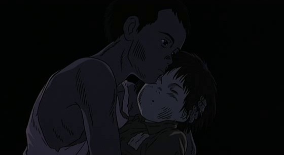Car un autre aspect de la guerre au Japon que le film décrit en filigrane, c’est la vie « à l’arrière ». La règle est simple, formulée par la tante qui recueille Seita et Setsuko en rechignant : a le droit de manger (avec décence) celui qui travaille pour la patrie, celui qui participe à l’effort de guerre. On apprend que Seita travaillait dans une usine mais que celle-ci, comme son école, a été détruite par les bombardements. Les nombreuses fois où la tante revient à la charge, reprochant à son neveu de ne pas se bouger assez, paraissent n’avoir que peu d’impact sur les deux protagonistes. De fait, et comme Nosaka le dit lui-même, Seita n’est pas vraiment une figure idéale de l’enfant précocement combatif et raisonné. Il ne se précipite à aucun moment pour trouver un travail, fait la tête dure lorsque la nourriture commence sérieusement à manquer et qu’on lui conseille de quitter son abri de fortune et de retourner chez sa tante, se réjouit des bombardements qui lui permettent de voler dangereusement mais avec une insouciance effarante les habitants du coin pendant que ceux-ci sont aux abris. Sa négligence paraît même précipiter la mort de sa petite sœur, comme nous le suggère un montage parallèle où lui est constamment en ville à chercher plus ou moins efficacement à manger tandis que Setsuko s’éteint lentement, seule dans leur abri de fortune. Mais il est indéniable que, dans les deux tiers du film, le jeune âge de sa sœur, les caprices et les vrais chagrins dévastateurs (l’épisode des kimonos de la mère) de celle-ci contraignent Seita à passer la majorité de son temps à ménager la faim ou le moral de Setsuko. Les bonbons aux fruits qui apparaissent dès le pré-générique comme un élément important sont un véritable « anti-pleurs » auquel recourt souvent le garçon pour calmer sa sœur. Le plus touchant est certainement de voir celle-ci se prendre progressivement en charge elle-même, économiser les bonbons, les rentabiliser en remplissant la boîte vide d’eau qui prend leur goût, et finalement les fantasmer, puisque que dans le délire qui précède sa mort, elle suce des petits boutons en plastiques en croyant déguster encore les fameux bonbons.