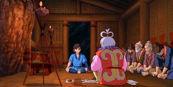 Sur ce dernier point, il convient néanmoins de faire la part des choses : si Nausicaä et Le château dans le ciel reprenaient plutôt clairement les détails de base de la thèse campbellienne (en gros, la récurrence des mêmes schémas archétypaux au cœur de chaque mythe, et le parcours d’un héros décrit à travers différentes étapes : appel à l’aventure, épreuves, combat, fuite, retour, délivrance, émancipation), Princesse Mononoké ne mange pas forcément du même pain. Déjà parce que le héros ne répond pas à l’appel de l’aventure mais réagit en conséquence face à un besoin de survie (la sienne, ainsi que celle de son village), mais aussi en raison de l’absence de guide ou de mentor dans l’intrigue. En outre, on se permettra de considérer que le mentor, censé guider l’aventurier tout en installant chez lui une distance entre ses désirs et les dangers qui le menacent, aurait ici constitué un frein au héros. Tout au long de son voyage, teinté d’émotion et de mélancolie, Ashitaka n’aura de cesse que de rencontrer des idées contradictoires, certes animées par des intentions précises et ambigües (l’une des pires facilités d’interprétation serait, par exemple, de considérer Dame Eboshi comme une méchante), qui viendront étayer son jugement et enrichir sa perception des choses. Son objectif est aussi simple qu’empreint d’un puissant sentiment humaniste : « Porter un regard sans haine sur le monde ».