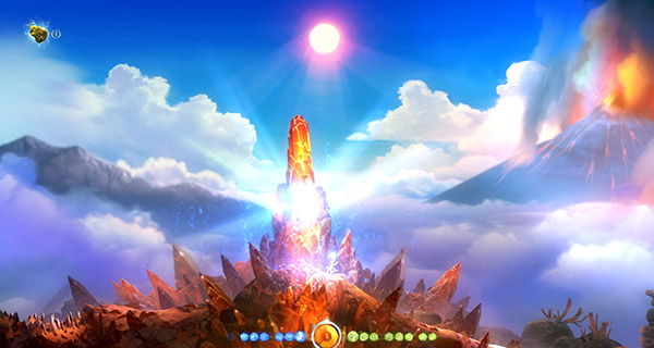 S’il n’est pas rare qu’Ori and the blind forest nous évoque telle ou telle œuvre culturelle au gré de sa progression, il n’en reste pas moins que celles-ci ne phagocytent jamais la cohérence visuelle de l’ensemble. Animations faites main, travail permanent sur la lumière, la palette de couleurs jouant sur les contrastes et l’identité des environnements traversés (volcan, grotte, marais…) ; le jeu opte pour une charte graphique lui conférant une personnalité dans laquelle se fondent ses emprunts artistiques les plus évidents. Mieux, c’est dans son obsession du mouvement que l’univers du jeu trouve le caractère organique qui manque à tant des derniers metroidvania en date (Dust : an Elysian Tail en premier lieu, auquel il fut largement comparé). Le monde d’Ori est un monde vivant, conformément aux croyances animistes qui l’habitent dès son postulat de départ. Un point fondamental qui témoigne du jusqu’au-boutisme de cette production Moon Studios et de l’écart qui la sépare du tout-venant.