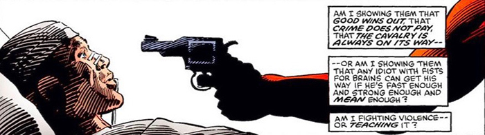 C’est ce que démontrera Frank Miller, certainement le plus grand contributeur à l’histoire du personnage. Sous sa plume, se dessine un univers uniquement constitué par des nuances de gris. Le bien et le mal se mêlent et aucun protagoniste n’est fait que d’ombre ou de lumière. De par ces déchirements, Miller fait de Murdock un être psychologiquement troublé et prompt à dérailler. Il suffit de mesurer son état de déni lors de la mort d’Elektra, car il ne l’accepte qu’après avoir exhumé le cadavre de son ancien amour. En février 1983, le dessinateur-scénariste met fin à sa prestation mensuelle sur la série et conclut cette démarche avec Roulette. Au chevet de son ennemi Bullseye paralysé, il se lance dans une partie de roulette russe. En même temps, il lui relate sa rencontre avec un enfant admirant Daredevil. Flatté, il ne s’inquiètera pas que cette admiration se base sur de mauvaises raisons et ne saura prévenir ses répercussions dramatiques. L’événement le place aussi face à son incapacité à agir en tant que Matt Murdock, ses actions étant niées par celles de Daredevil. Lorsqu’il est temps de presser une dernière fois la détente, sa croisade paraît absurde, incontrôlable et inéluctable. Mais comme le montre Roulette, la qualité de la série est de ne pas se limiter à la seule personnalité de Daredevil. Car le drame de sa vie agit tel un miroir sur les autres personnages, leur dévoilant leurs propres paradoxes. Vivre auprès de Daredevil équivaut à subir les assauts d’une tempête balayant tout autour d’elle. Ceux-ci restent à ses côtés, le supportent ou tout du moins essaient, car ils savent qu’ils sont les piliers sur lesquels Murdock peut se reposer et lui octroyer un peu de paix.