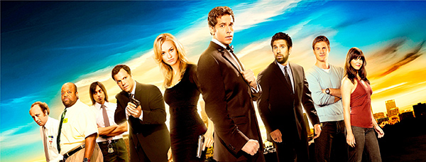 Il est courant de voir dans toute série proto-geek une vraie tendance à la parodie, aussi décontractée soit-elle. Et en matière de parodie, la série Chuck, c’est avant tout un générique très James Bond dans l’âme qui envoie du lourd tout en résumant son concept original en moins de quarante secondes. Le temps de voir un petit employé benêt et loser sortir du nez de son propre interprète, prendre la fuite tout en évitant les balles d’on ne sait pas qui, bondir d’un plan à l’autre en enchaînant les clins d’œil cinéphiles (utiliser le jetpack d’Opération Tonnerre, chevaucher une balle façon Docteur Folamour, etc…) et les moyens de locomotion (voiture, hélicoptère, skateboard, etc…), sauver sa tête en évitant les étoiles d’un ninja et assumer plein cadre l’importance de l’outil informatique (le générique se finit sur les touches d’un clavier d’ordinateur rempli de logos cachés), on sait déjà à quoi s’attendre : Chuck, c’est en gros le geek qui quitte soudain le monde des « nerds » (il fait partie du « Nerd Herd » qui travaille dans un Darty local nommé « Buy More » : ça veut tout dire…) pour s’improviser agent secret. En gros, on arrête de réparer des virus binaires pour s’en aller occire des virus plus vénères dans le monde réel. Mais avec humour, bien entendu, comme le sous-entend le désamorçage visuel et sonore qui irrigue chaque photogramme de ce générique. Et surtout avec une bonne dose de références logées dans un disque dur sérialisé de cinq téraoctets, enrichi au clin d’œil qui fait tilt et à la grosse vanne légère qui tempère le stress des situations. Le moins que l’on puisse dire, c’est que la série, étalée sur cinq saisons plus qu’inégales, nous aura fait passer peu à peu de « Suck my geek ! » à « Geek, you suck… » en moins de temps qu’il n’en faut à son héros pour rouler des mécaniques.